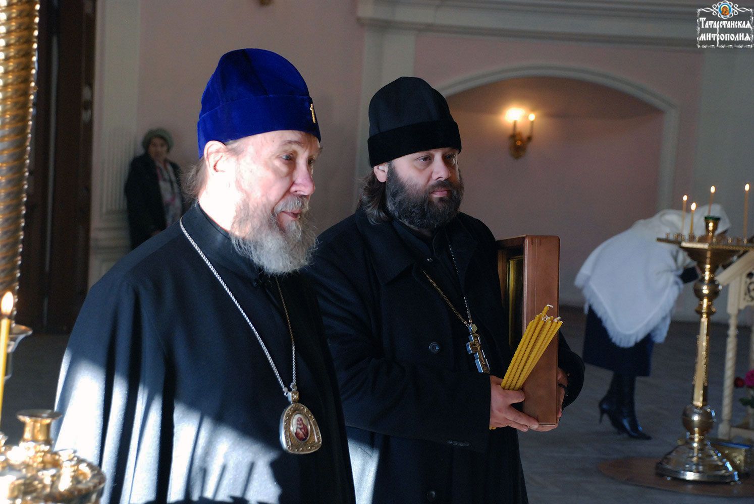 В стенах обители великую княгиню и сопровождавших ее лиц встречали глава Татарстанской митрополии митрополит Казанский и Татарстанский Анастасий и настоятель монастыря игумен Питирим (Рыбанин).