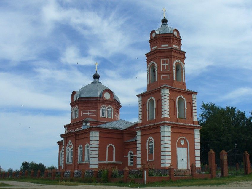 Массивное здание храма с четырехъярусной колокольней построено в псевдоренессансных традициях. В интерьере сохранились фрагменты клеевой росписи (Волж.новь, 1997, 31 мая)