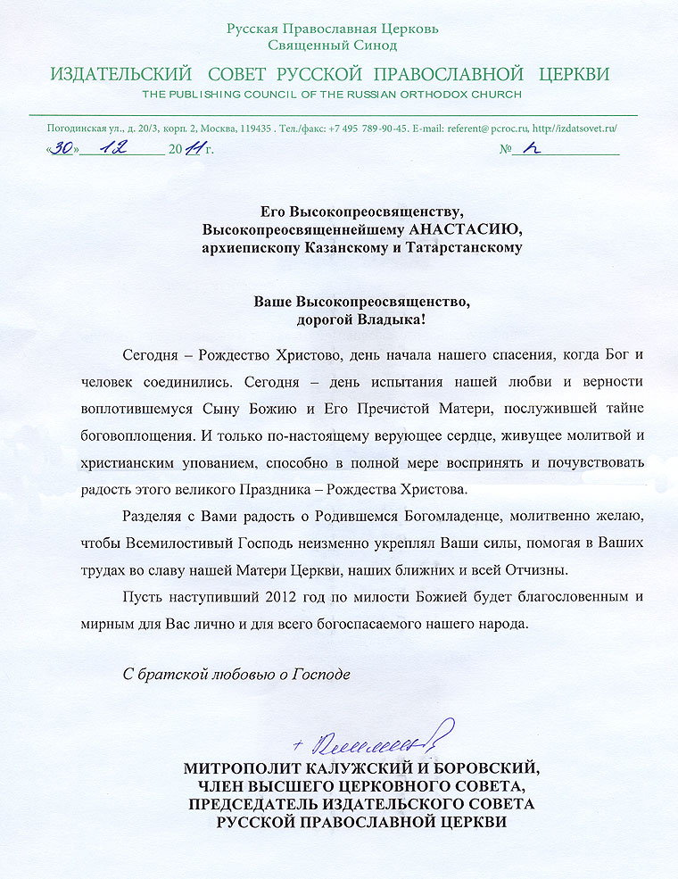 Председатель Издательского Совета РПЦ митр. Климент поздравил Архиепископа Анастасия с Рождеством.